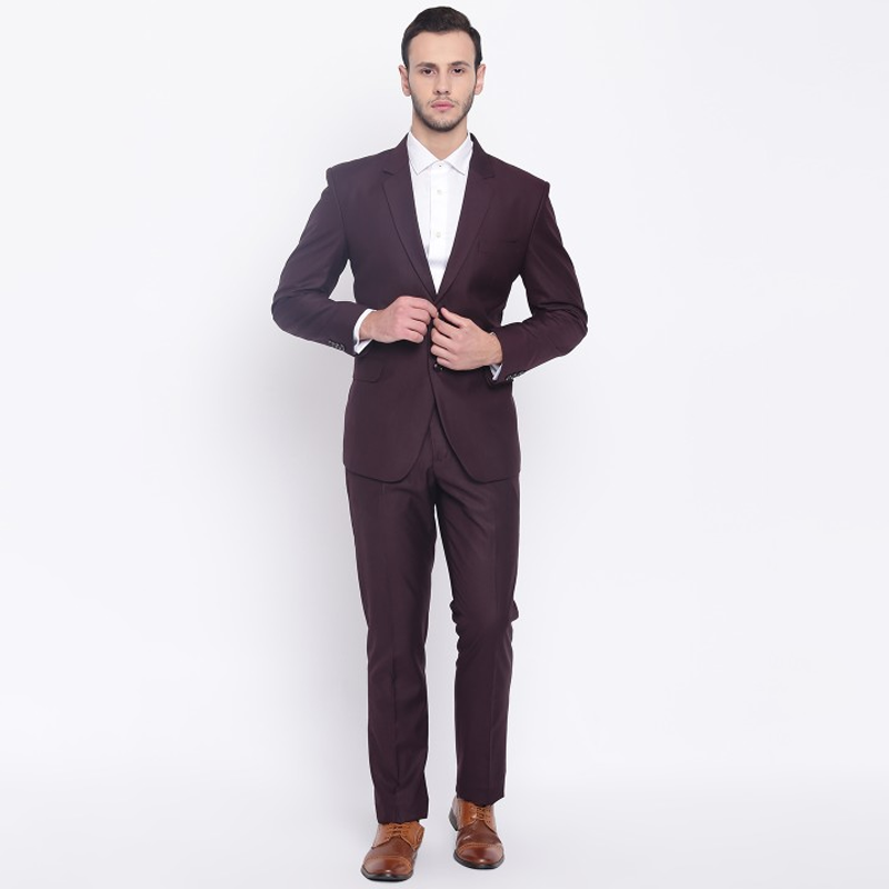 Men Burgundy Solid Single-Breasted Slim-Fit Formal Suit