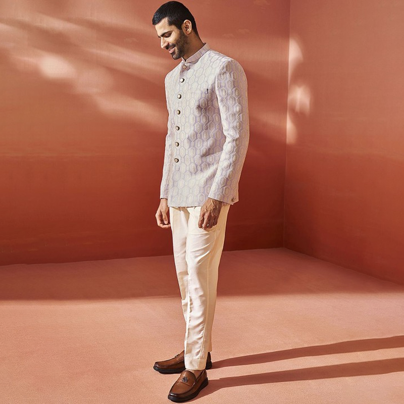 "Purple self-design slim fit bandhgala has long sleeves, mandarin-collar and button closure Cream-colored solid trouser has 2 pocket button closure Size & Fit The model (height 6') is wearing a size 36 Material & Care Cotton Blend Dry Clean Preferably or cold light wash"