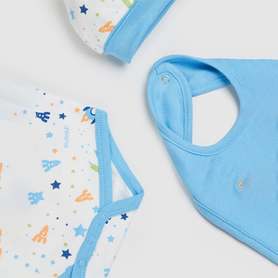 This baby apparel gift set consists of 1 bodysuit, 1 beanie, and a bib