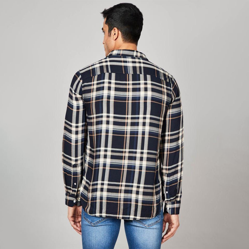 Look stylish in this cool casual shirt with contrasting bold checks over a fashionable navy tone. The curved hem adds to the style factor. You can roll up the full sleeves in you want. Team it with a pair of cool denim pants and sneakers for a complete trendy look.