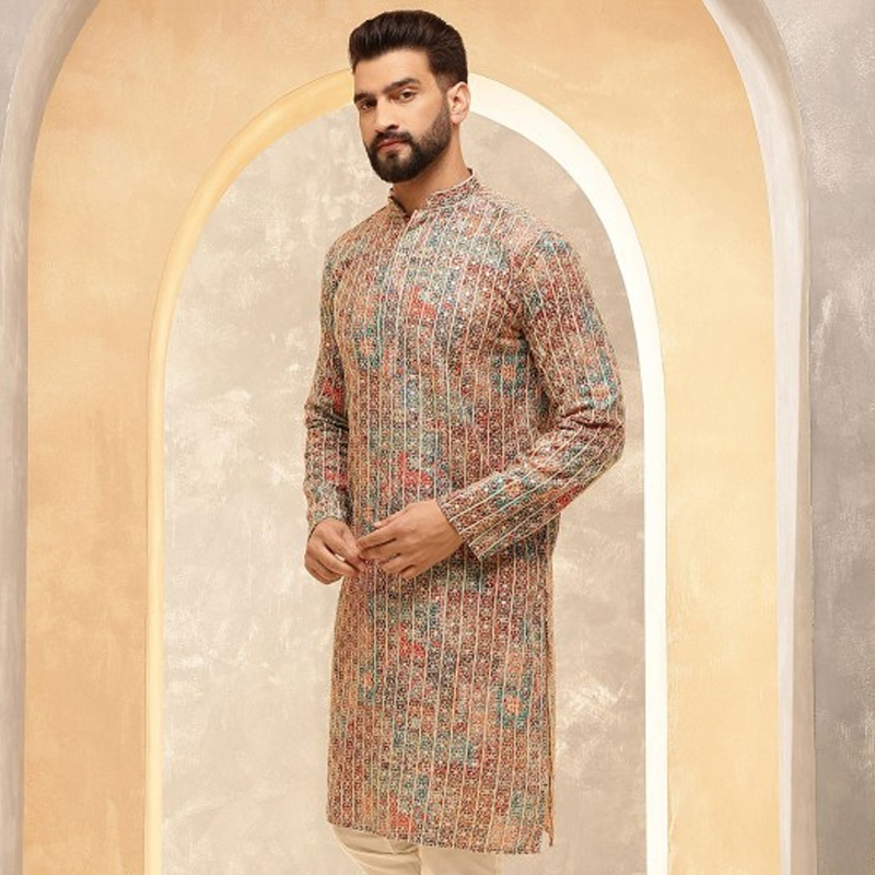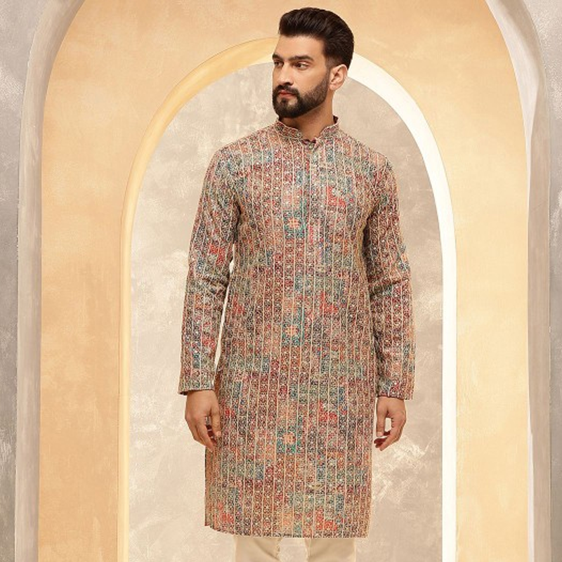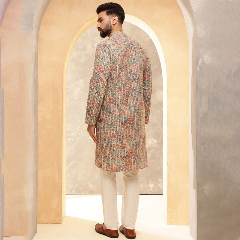 Sleeve Length: Long Sleeves Shape: Straight Neck: Mandarin Collar Print or Pattern Type: Floral Design Styling: Regular Slit Detail: Side Slits Ornamentation: Zari Length: Knee Length