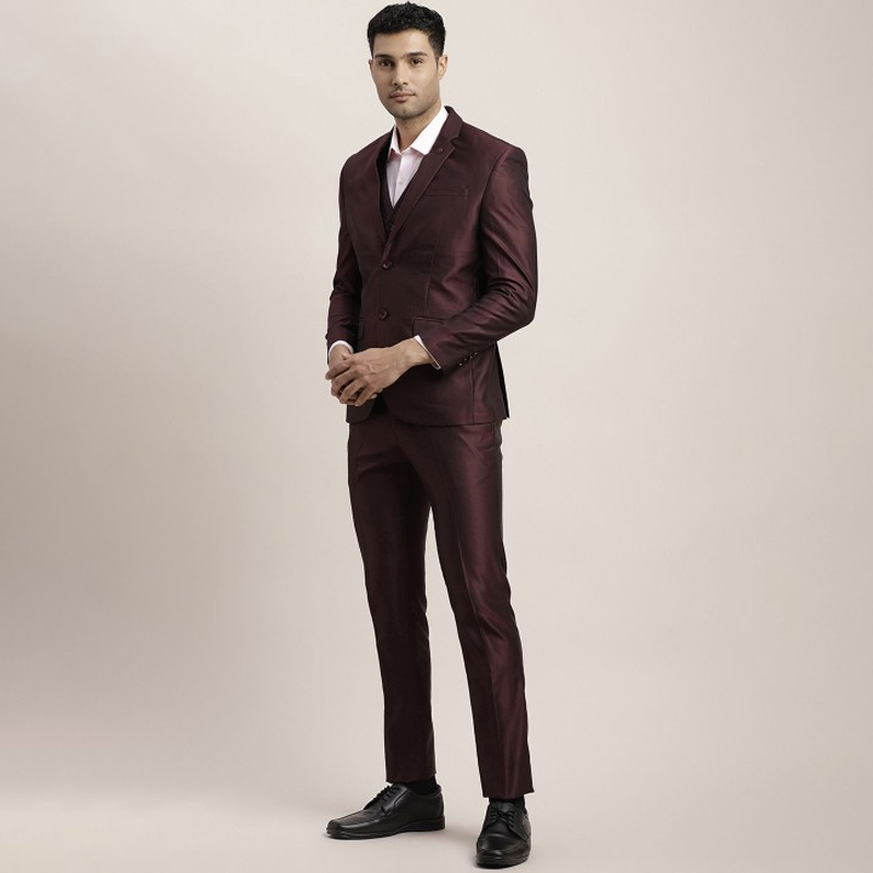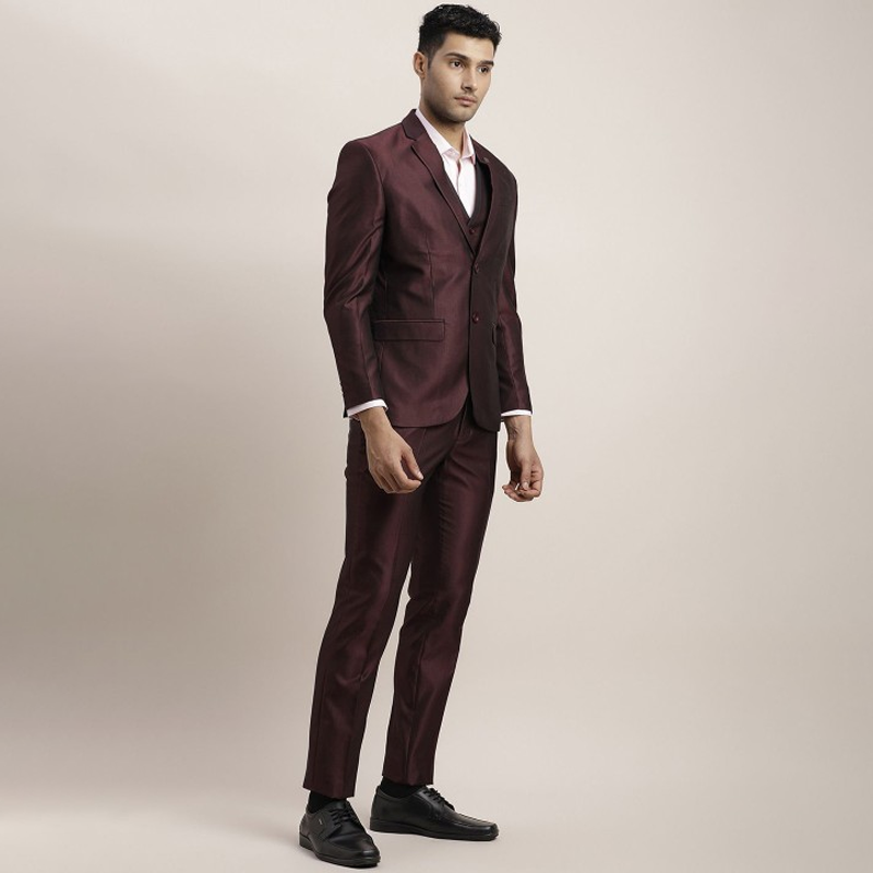"Brown self design slim-fit 3-piece formal suit Brown self design slim-fit blazer, has a notched lapel, single-breasted with button closure, long sleeves, one welt pocket, two flap pockets and double vented back hem A pair of brown self design mid-rise trousers, has a zip fly with button closure, two pockets Brown self design slim-fit waistcoat, has a V-neck, button closures on the front, sleeveless Size & Fit Slim-fit The model (height 6') is wearing a size 36 Material & Care Poly-Viscose Dry Clean"