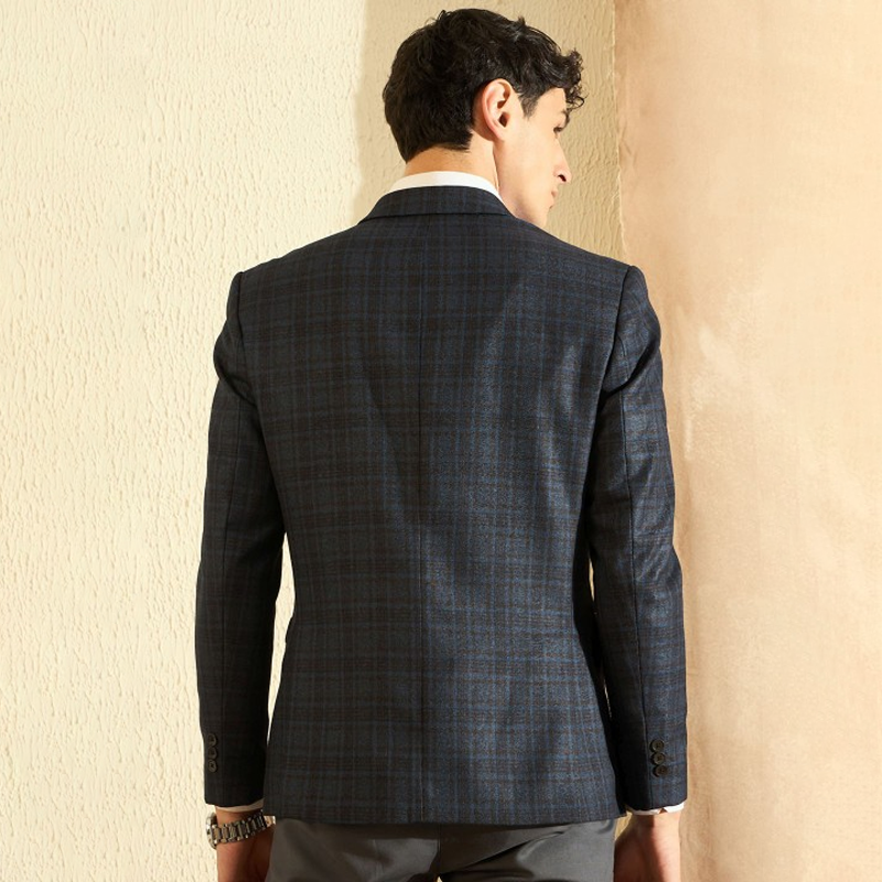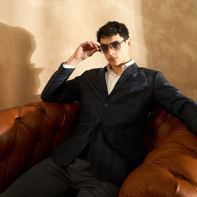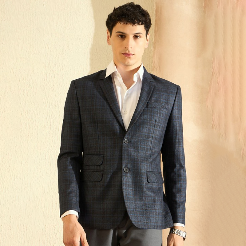 "Blue solid regular-fit blazer, has a notched lapel, long sleeves, single-breasted with double button closure, two flap pockets, one welt pocket and a double-vented back hem