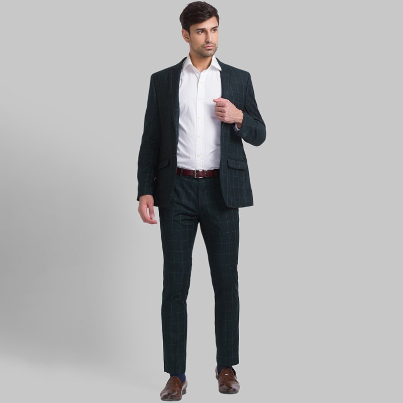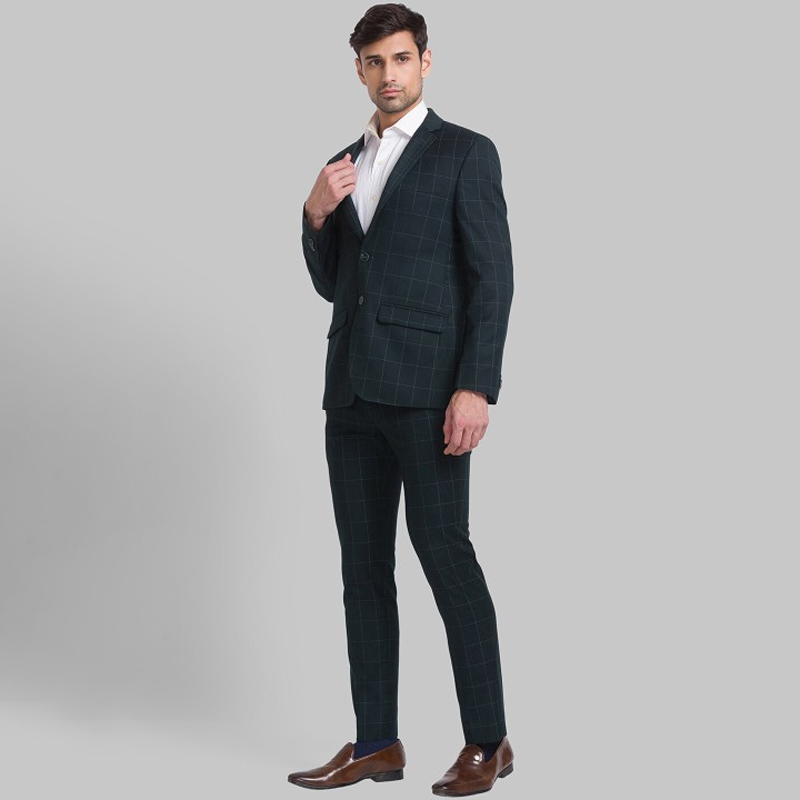 "Checked slim fit 2 piece formal suit Checked single-breasted formal blazer, has a notched lapel, button closures, long sleeves, two flap pockets and single welt chest pocket A pair of checked formal trousers, has four pockets, a zip fly button closure and a waistband with belt loops Size & Fit Super slim-fit The model (height 6') is wearing a size 36 Material & Care Terry Rayon Blend Dry Clean"
