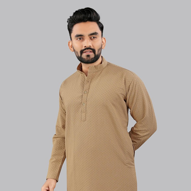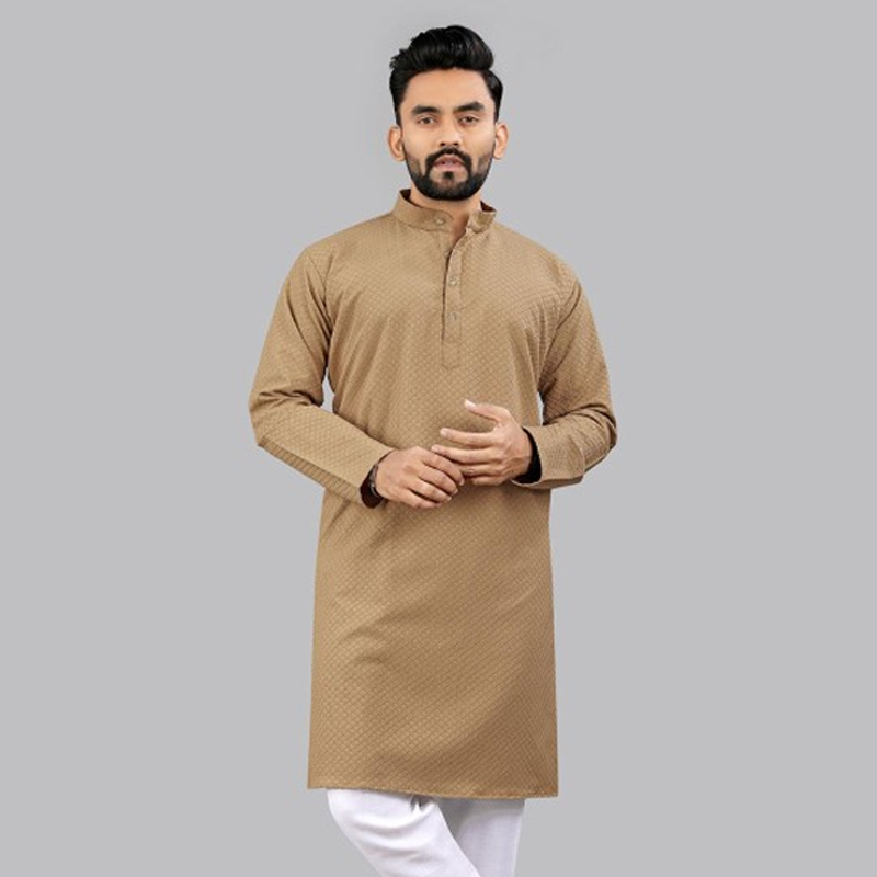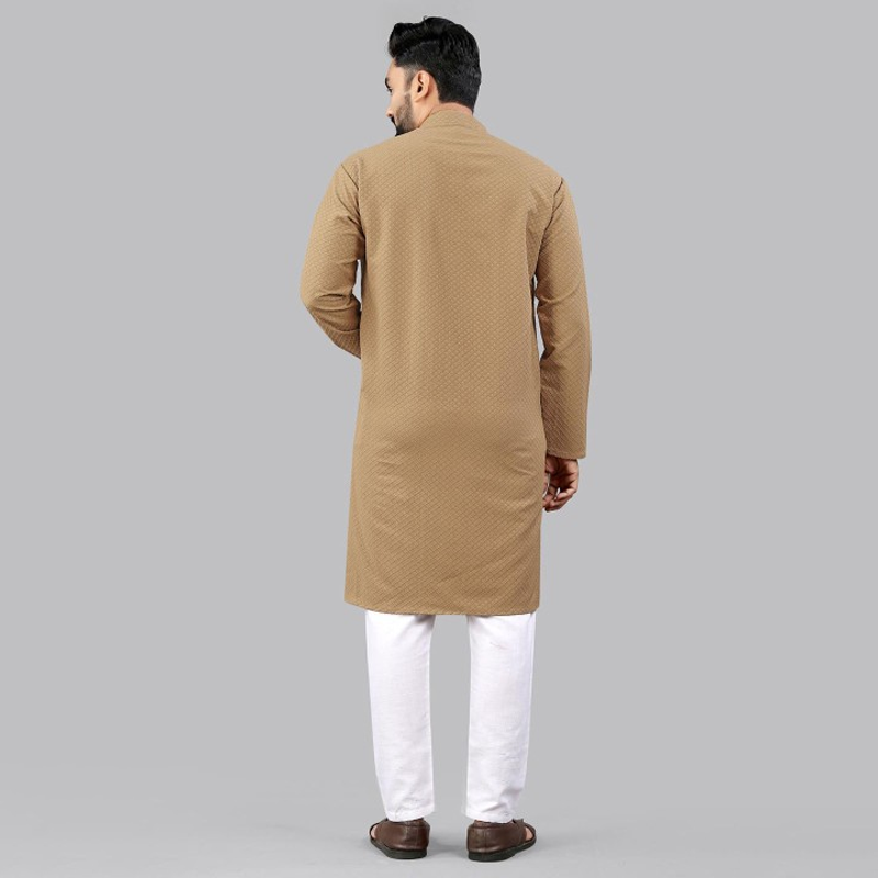 Colour: beige Abstract embroidered Mandarin collar Long, regular sleeves Straight shape with regular style Knee length with straight hem Machine weave regular cotton Size & Fit 1 The model (height 6') is wearing a size M Material & Care Wash Care: Regular Machine Wash. Use Mild detergent or Soap. Wash Dark Colors Separately in cold water as dark colors may bleed into light colored clothes.