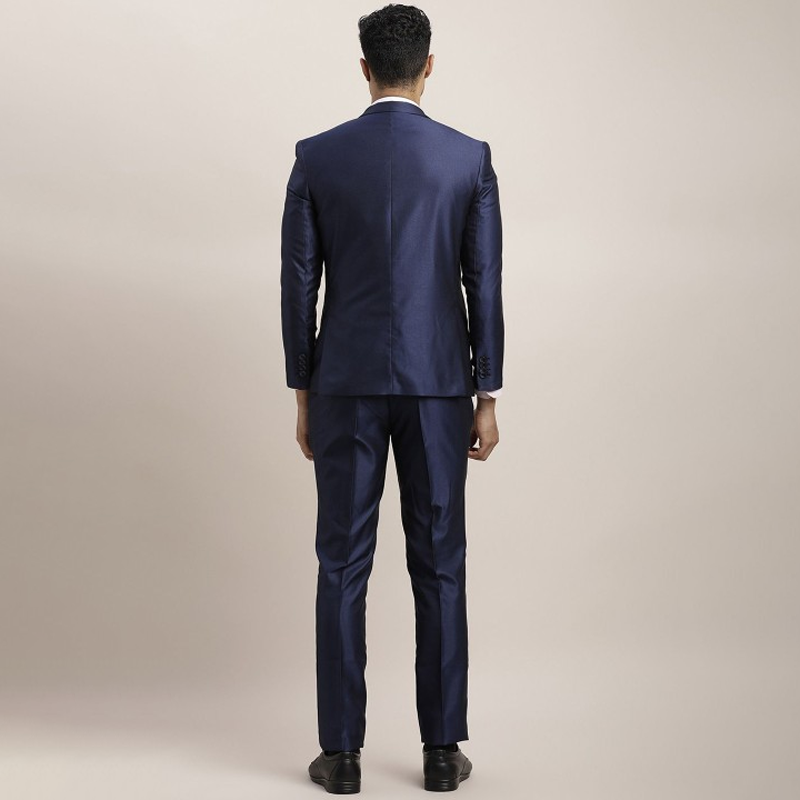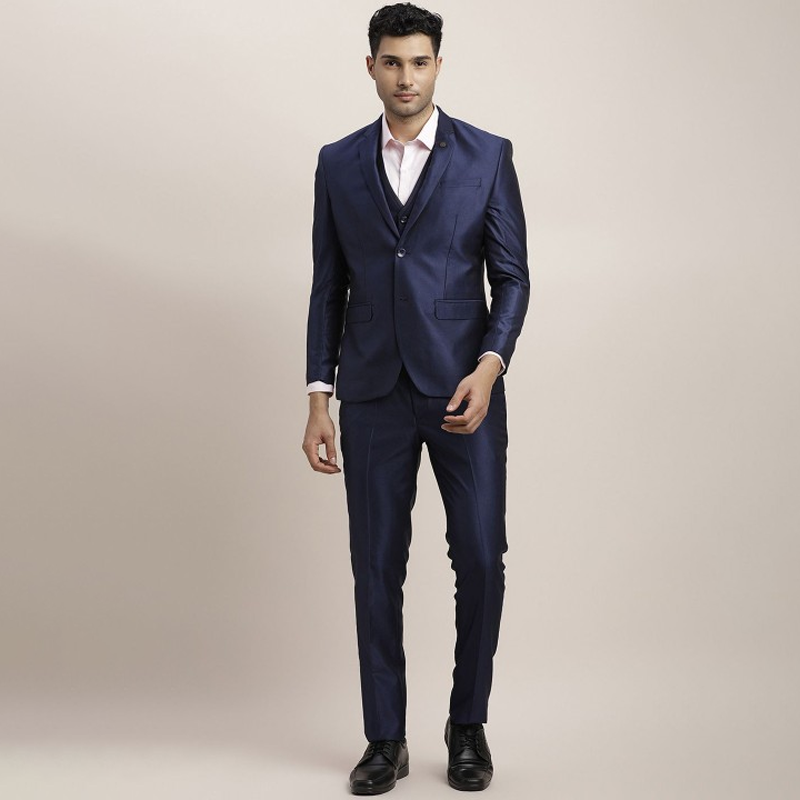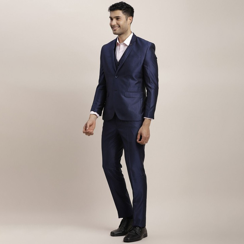 "Blue self design slim-fit 3-piece formal suit Blue self design slim-fit blazer, has a notched lapel, single-breasted with button closure, long sleeves, one welt pocket, two flap pockets and double vented back hem A pair of blue self design mid-rise trousers, has a zip fly with button closure, two pockets Blue self design slim-fit waistcoat, has a V-neck, button closures on the front, sleeveless Size & Fit Slim-fit The model (height 6') is wearing a size 36 Material & Care Poly-Viscose Dry Clean"