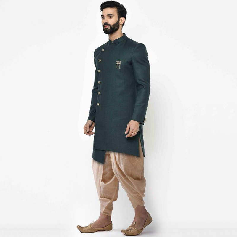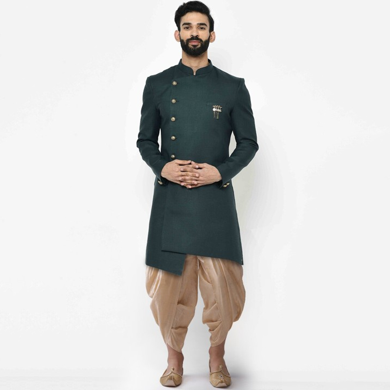 Olive-green solid sherwani, has a mandarin collar, stylised front with button closures and long sleeves