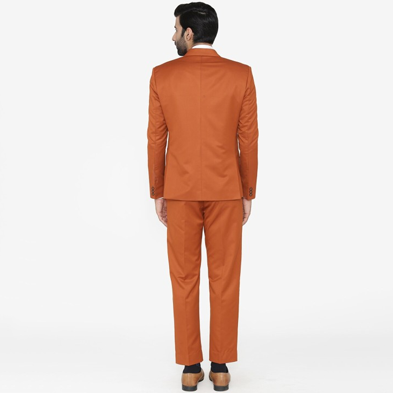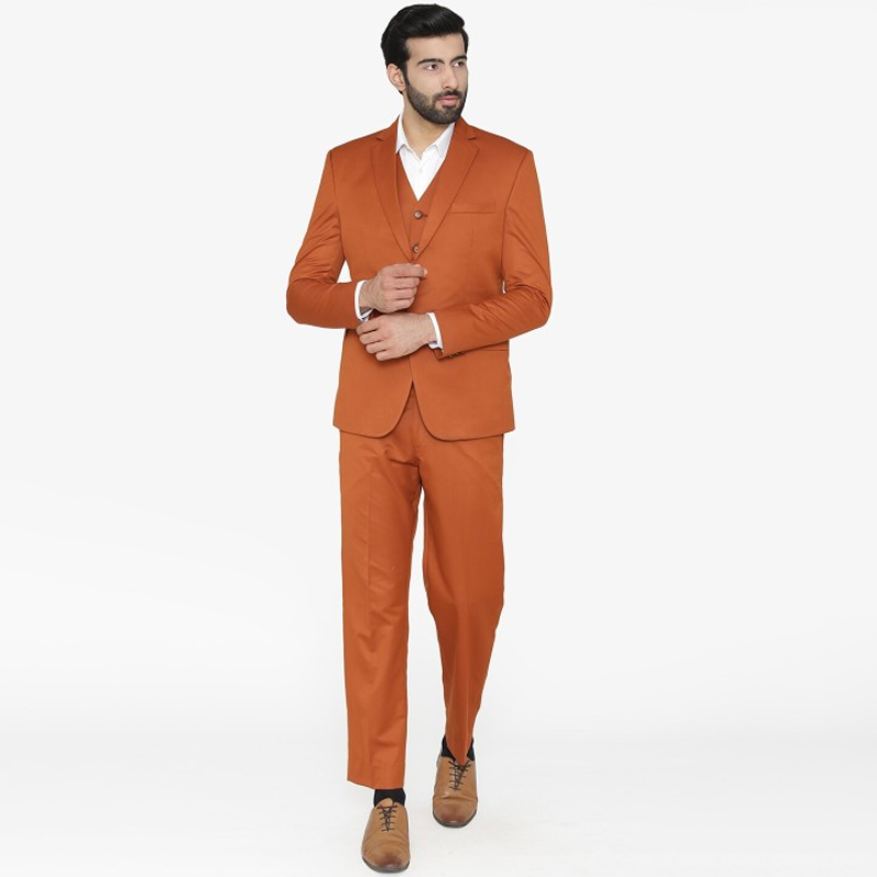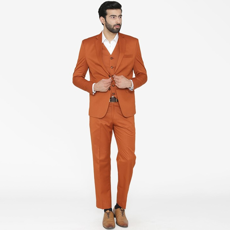 "Orange solid three-piece suit Orange solid blazer, has a notched lapel, single-breasted with double button closures, long sleeves, three pockets, and a double-vented back hem. Orange solid mid-rise trousers, has a waistband with belt loops, zip fly with a button closure Orange solid waistcoat, has a V-neck, a short button placket, two pockets, and sleeveless Size & Fit Regular fit The model (height 6"") is wearing size M Material & Care Polycotton Dry Clean Only"