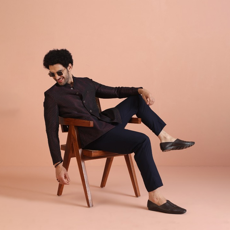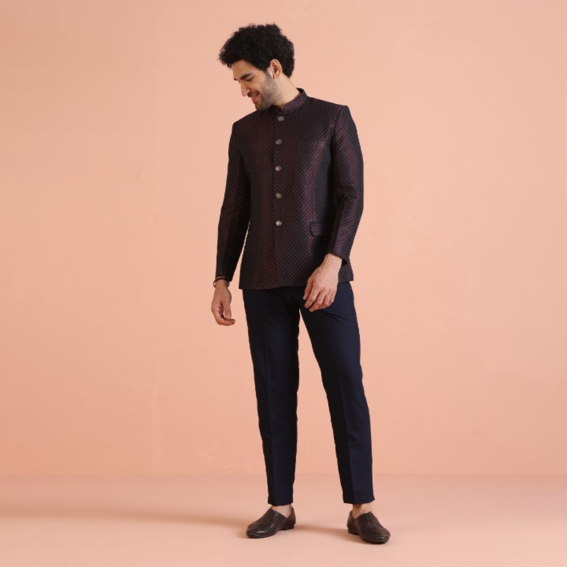 "Magenta-& navy blue 2 peice ethnic bandhgala suit Magenta-pink self design regular-fit bandhgala blazer, has a mandarin collar, long sleeves, a chest pocket, two welt pockets Navy-blue solid mid-rise regular trousers, a zip fly with hook-and-bar and button closure, a waistband with belt loop Size & Fit The model (height 6') is wearing a size S Material & Care Silk Blend Dry Clean"