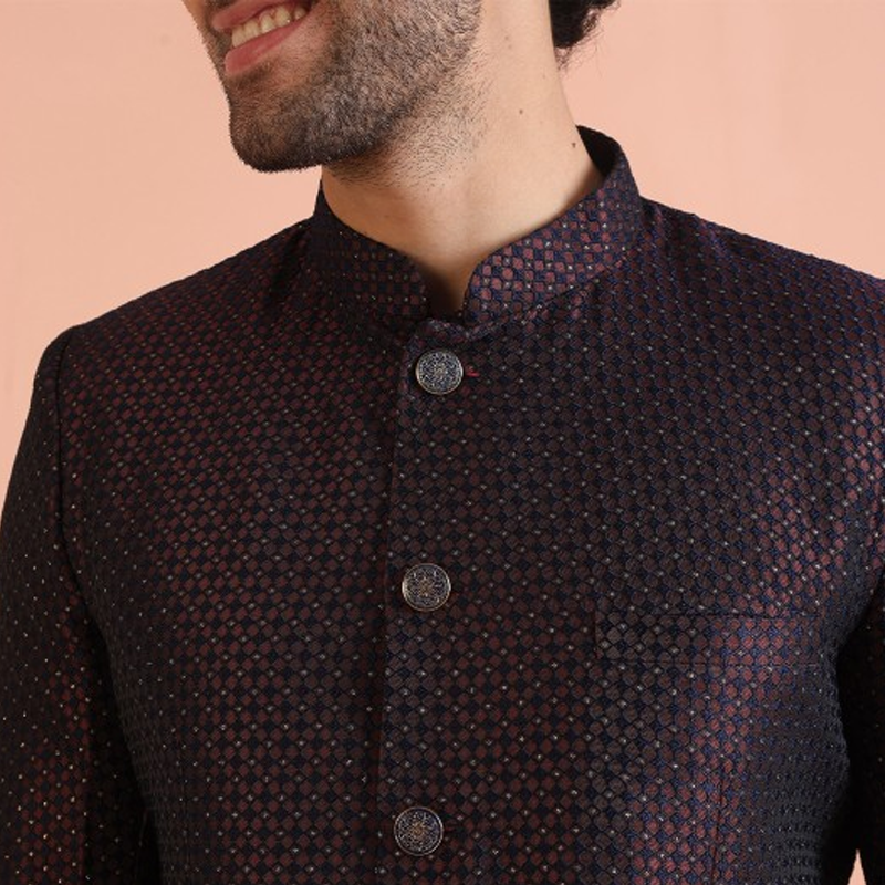 "Pattern: Self Design Fabric: Polyester Collar: Mandarin Collar Occasion: Ethnic Fit: Regular Fit Sleeve Length: Long Sleeves Bottom Closure: Button Front Styling: Bandhgala"