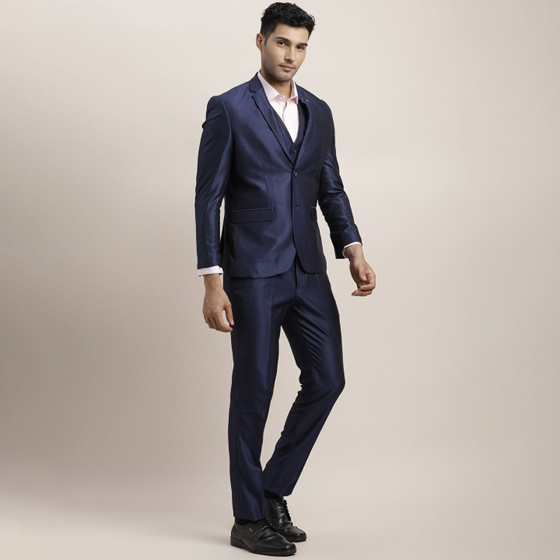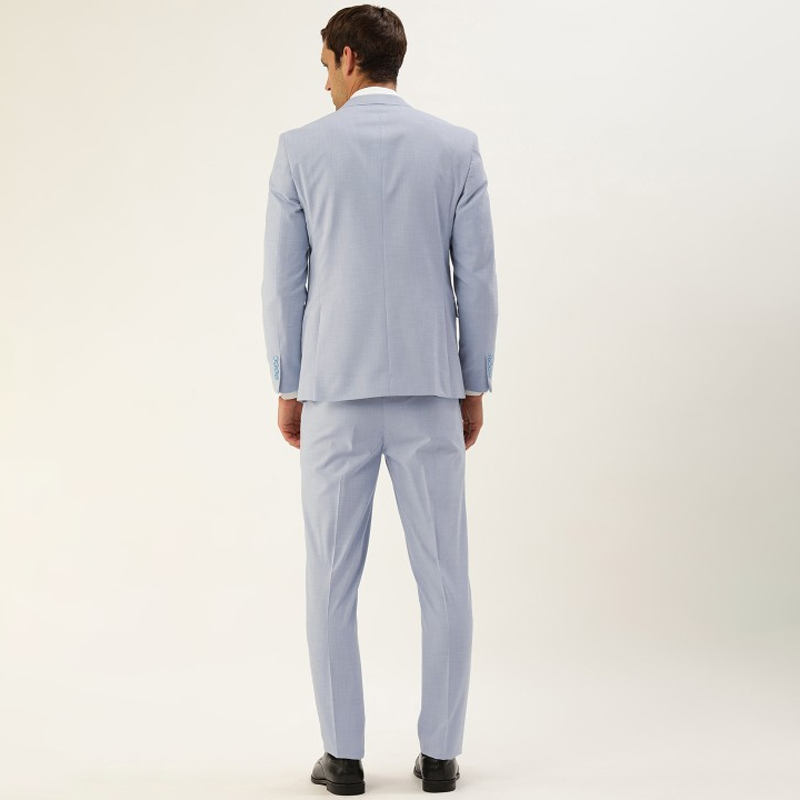 "Blue solid suits consists of a blazer and trouser Blue solid single breasted blazer has notched lapel collar, long regular sleeves, button closure and 4 pockets Blue solid trouser has button closure and belt loops with 4 pockets Size & Fit Size worn by the model: 40 Chest: 40"" Waist: 33"" Hips: 40"" Height: 6'2"" Material & Care Outer Shell: 80% Polyester, 19% Viscose, 1% Spandex Lining: 100% Polyester Dry Clean"