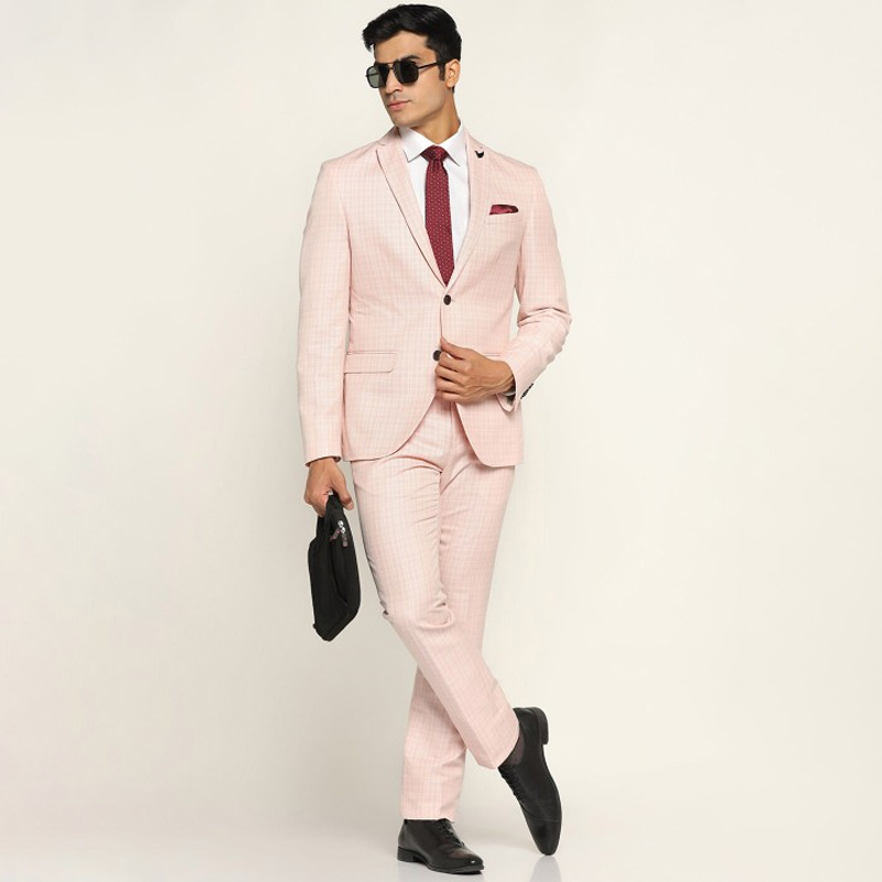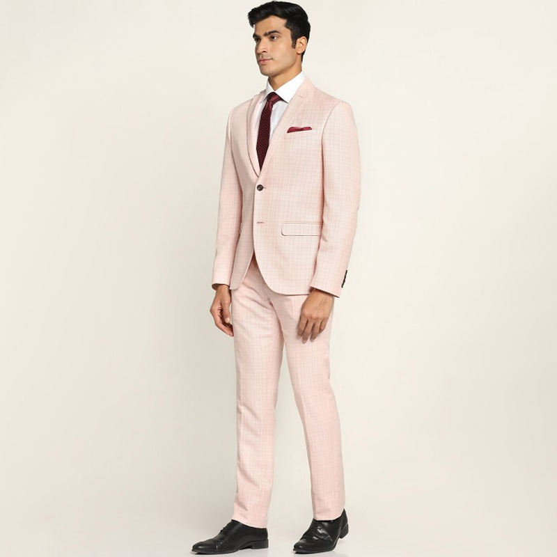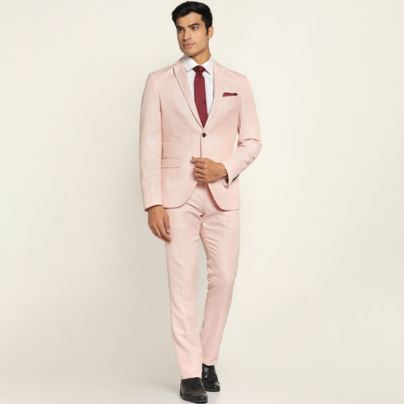 "Solid slim-fit formal 2- piece suit Solid slim-fit formal blazer, has a notched lapel collar, single-breasted with double button closures, long sleeves, two flap pockets, one chest welt pocket, an attached lining and a double vented back hem Solid slim-fit formal trousers, has a waistband with belt loops, zip fly with a button closure Size & Fit Slim-fit The model (height 6') is wearing a size 34 Material & Care 51% Polyester 27% Rayon 22% Flax Linen Dry Clean"