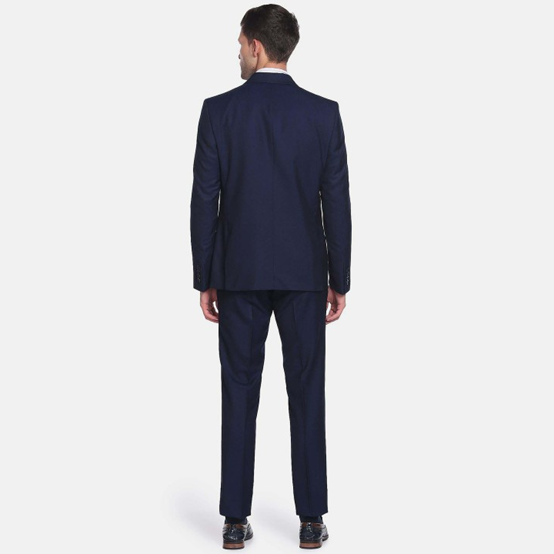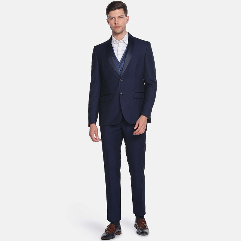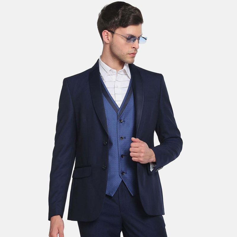 "Solid 3-piece self-design formal suit Solid slim-fit single-breasted blazer, has a Shawl collar with button closures, long sleeves, three pockets Solid slim-fit trousers has an elasticated waisted with zip closure, two pockets Printed single-breasted slim-fit Reversible waistcoat, has a V-neck, button closures on the front, and two pockets. Size & Fit Slim Fit The model (height 6') is wearing a size 36 Material & Care 72% Polyester, 26% Rayon Lining: 100% Polyester Dry clean"