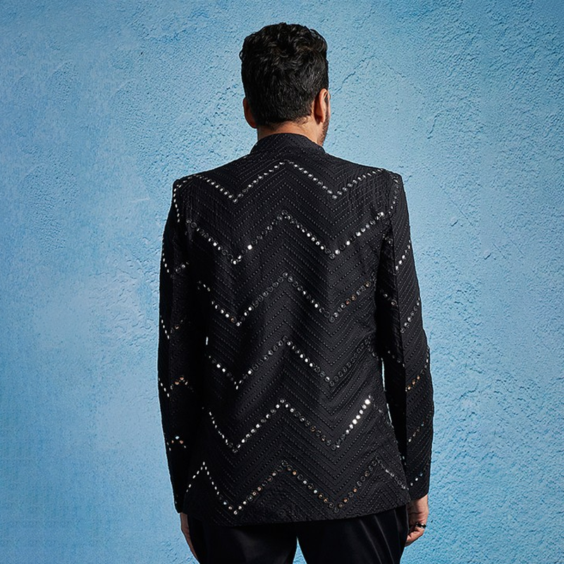 "Black self designed slim-fit blazer, has a mandarin collar, single-breasted with button closures, long sleeves, one welt pocket, and two flap pockets, and a vent less back hem