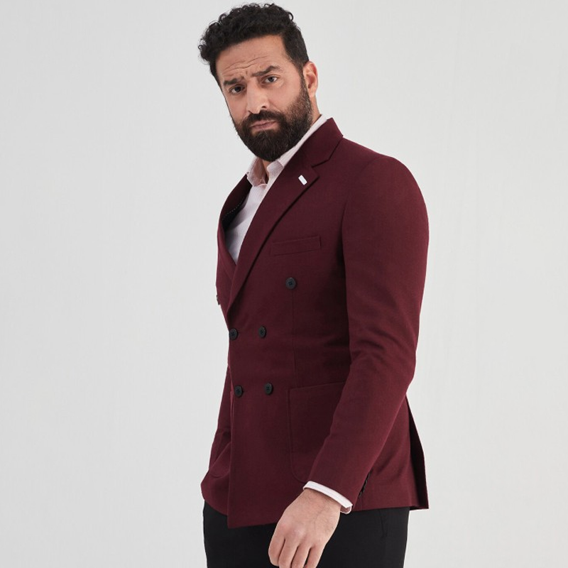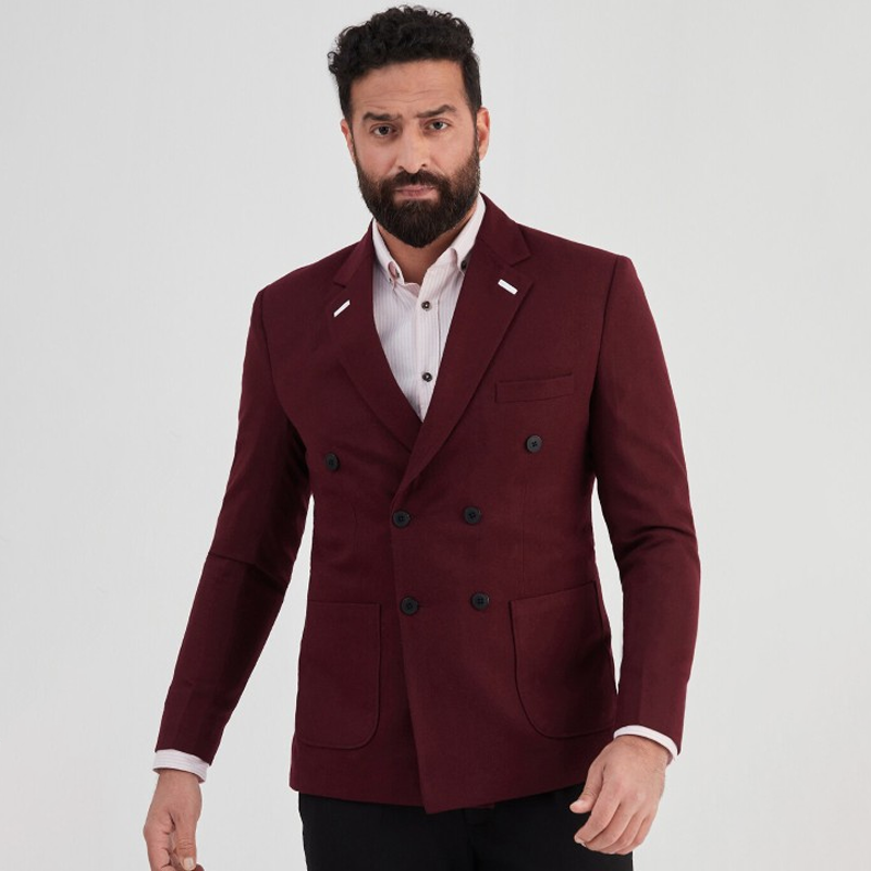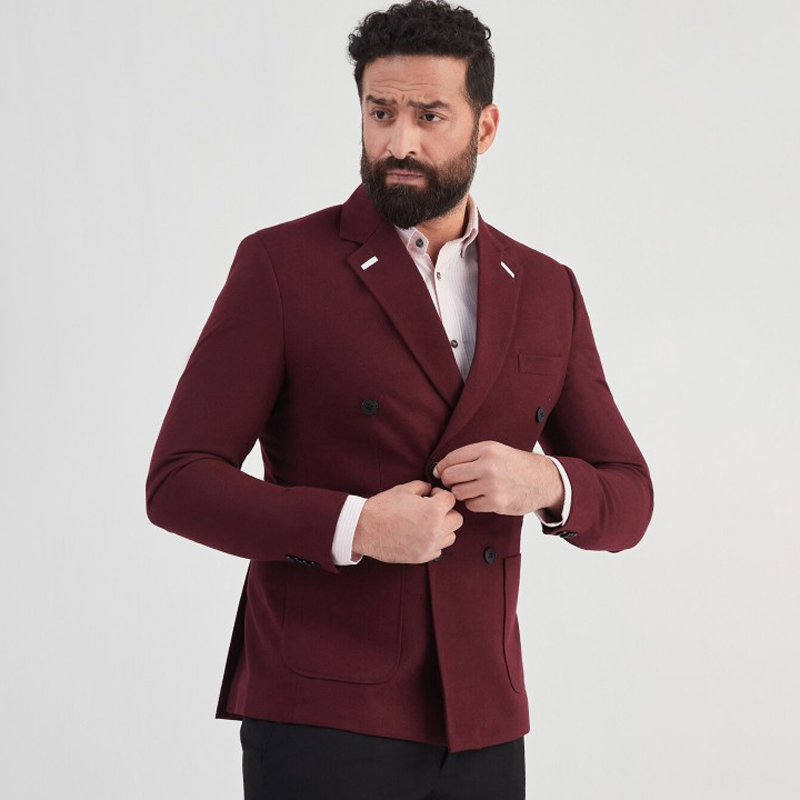 "Solid slim-fit blazer, has a notched lapel, double-breasted with button closure, long sleeves, vented back hem, and two pockets Size & Fit Slim-fit The model (height 6""') is wearing a size 36 Material & Care Viscose Rayon Dry Clean"