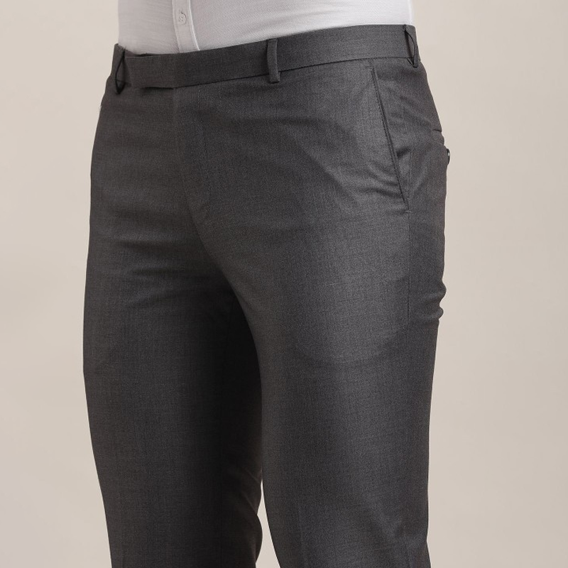 "Grey solid slim-fit formal suit Grey solid slim-fit blazer, has a notched lapel collar, single-breasted with button closure, long sleeves, one welt pocket, two flap pockets, and double vented back hem A pair of grey solid mid-rise trousers, has a zip fly with button closure, two pockets Size & Fit Slim-fit The model (height 6') is wearing a size 36 Material & Care Poly-Viscose Dry Clean"