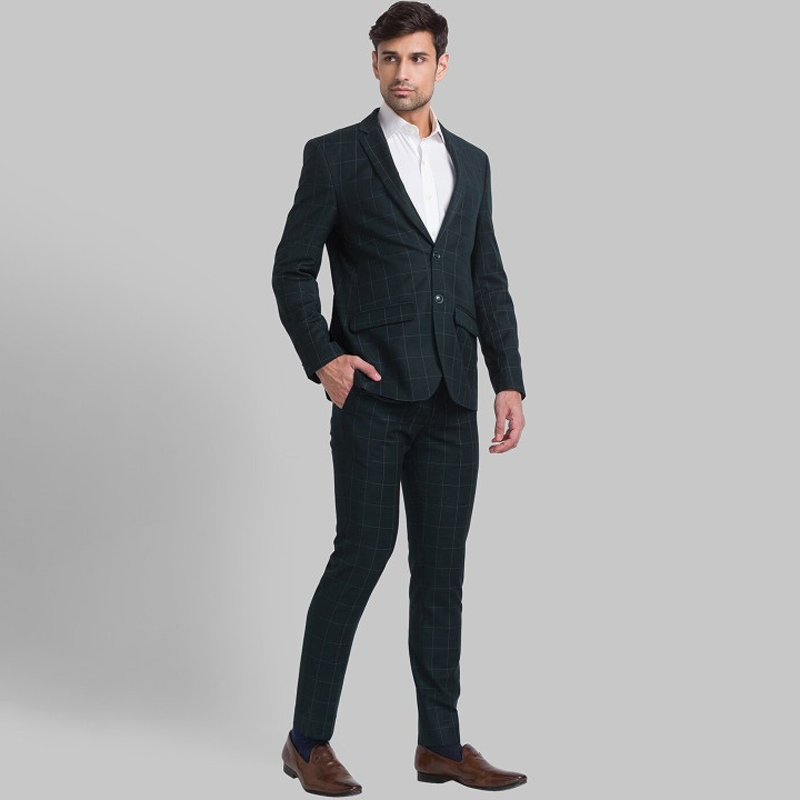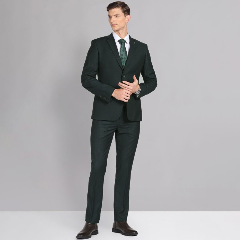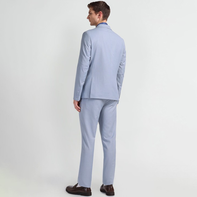 "Blue formal suit with waistcoat, blazers, and trousers Blue printed tailored-fit blazer, has a notched lapel, single-breasted with double button closures, long sleeves, one welt pocket, and two flap pockets, and a double vented back hem Blue printed mid-rise trousers, has a zip fly with a button and a hook-and-bar closure, two pockets, a waistband with belt loops Blue printed waistcoat, has a V-neck , a full button placket, sleeveless, and three pockets Size & Fit Tailored-fit The model (height 6') is wearing a size 36 Material & Care 70% Terylene Polyester, 30% Rayon Dry Clean"