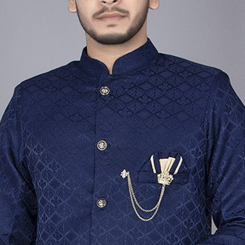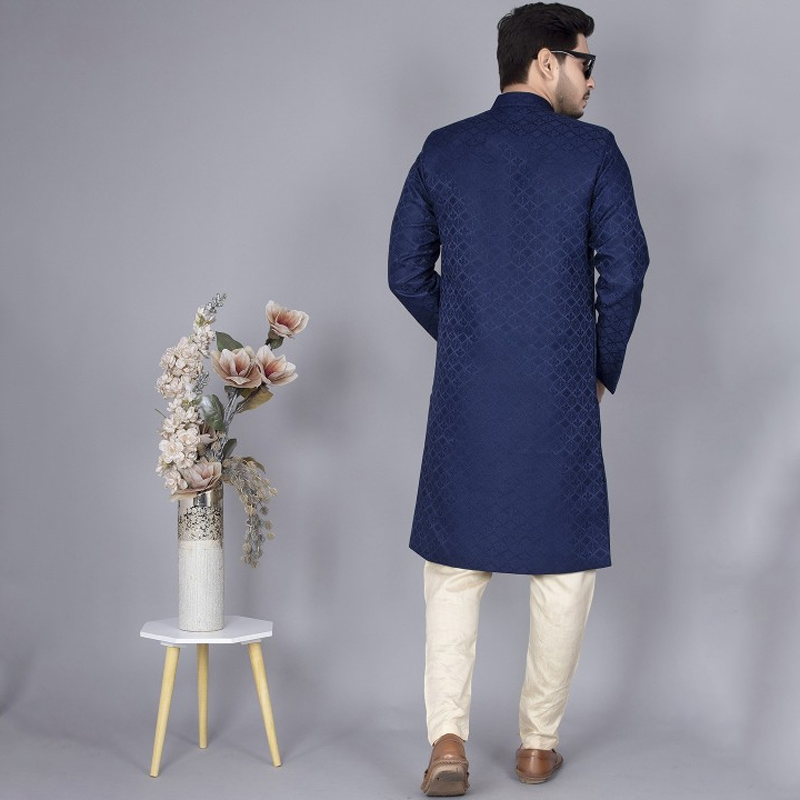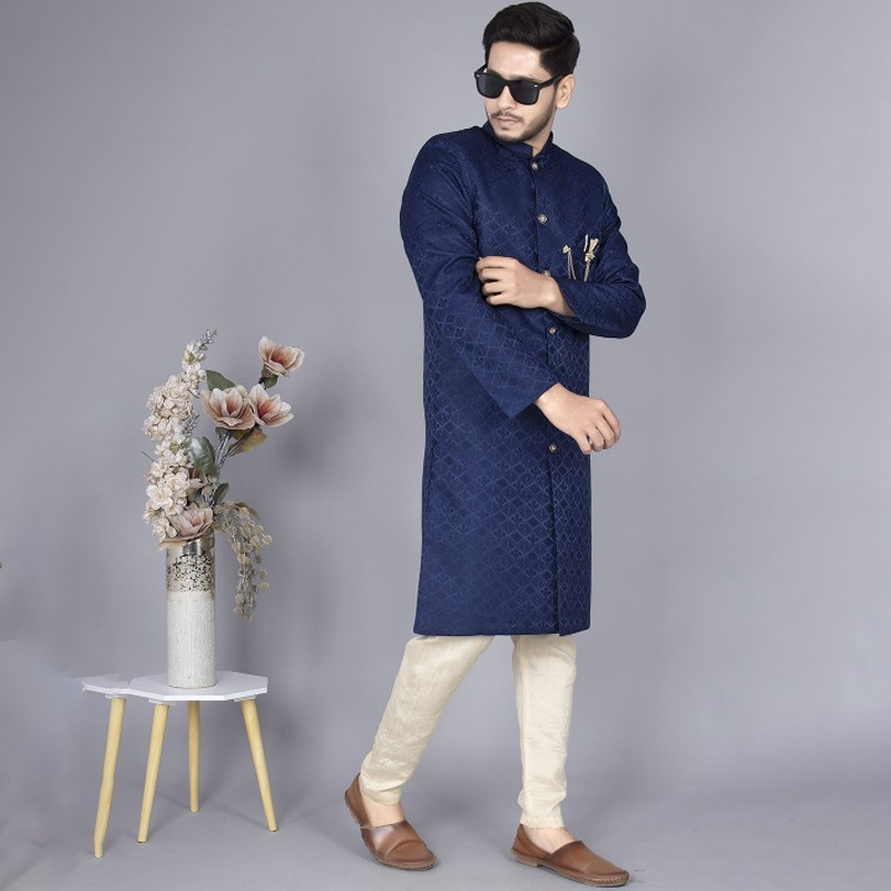Navy Blue self-design sherwani set Navy Blue self-design sherwani, has a mandarin collar with button closures and long sleeves Off White solid pyjamas, has an elasticated waistband with slip on closure Size & Fit The model (height 6') is wearing a size M Material & Care Top Fabric: Cotton Blend Bottom Fabric: Cotton Blend Dry Cleam