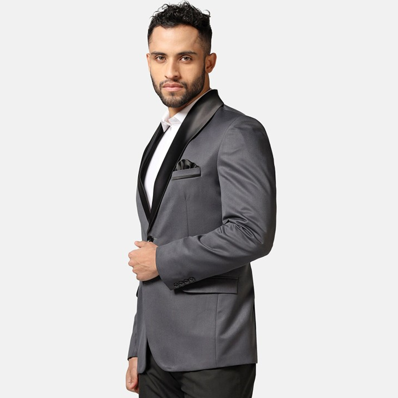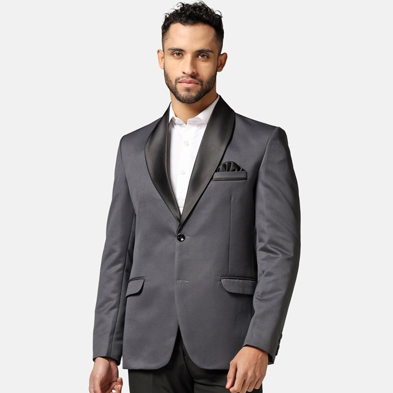 "Dark-grey and black solid slim-fit tuxedo blazer, has a shawl lapel, long sleeves, single-breasted with double button closure, two flap pockets, one welt pocket and a double-vented back hem
