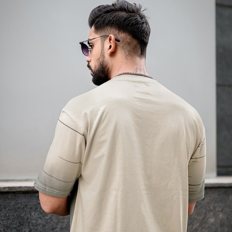 Beige Tshirt for men printed Longline length Round neck Short, regular sleeves Knitted cotton fabric Size & Fit Oversized The model (height 6') is wearing a size M Material & Care Cotton Machine Wash