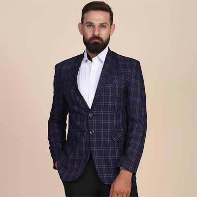 "Blue checked slim-fit formal blazer, has a notched lapel, long sleeves, single-breasted with double button closure, two flap pockets, one welt pocket and a double-vented back hem Size & Fit Slim-fit The model (height 6') is wearing a size 36 Material & Care Fabric: Wool Blend, Lining: Polycotton Dry clean only"