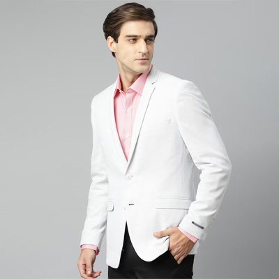 "Grey and white self-design formal blazer, has a notched lapel collar, long sleeves, single-breasted with button closure, double vented back hem, 5 pockets, an attached lining Size & Fit Slim fit The model (height 6') is wearing a size 40 Material & Care Material: 70% cotton, 30% polyester Lining: 100% polyester Dry Clean"