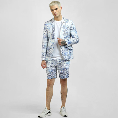"Blue and white printed regular-fit, has a notched lapel, single-breasted with double button closures, long sleeves, two flap pockets, one chest welt pocket, and a double-vented back hem Size & Fit Regular-Fit The model (height 6') is wearing a size 46 Material & Care Linen Dry Clean"